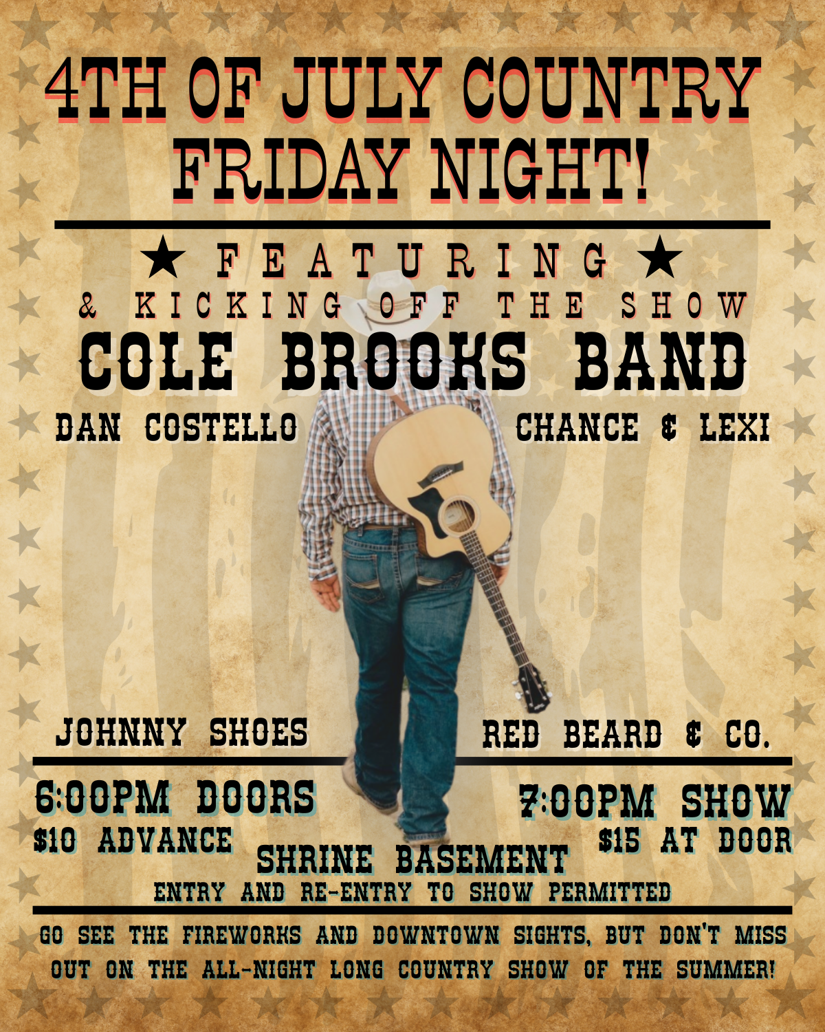 Celebrate Independence Day with a stacked lineup of the Treasure Valley’s best country & Americana artists: 🎶 COLE BROOKS BAND (opening the night!) 🎤 Chance & Lexi 🎸 Johnny Shoes 🎩 Dan Costello 🤠 Red Beard & Co. Come and go as you please — grab a drink, catch the fireworks downtown, then come back for more boot-stompin’ tunes ‘til late! Support local music. Celebrate the 4th. See you at Shrine. 🎇