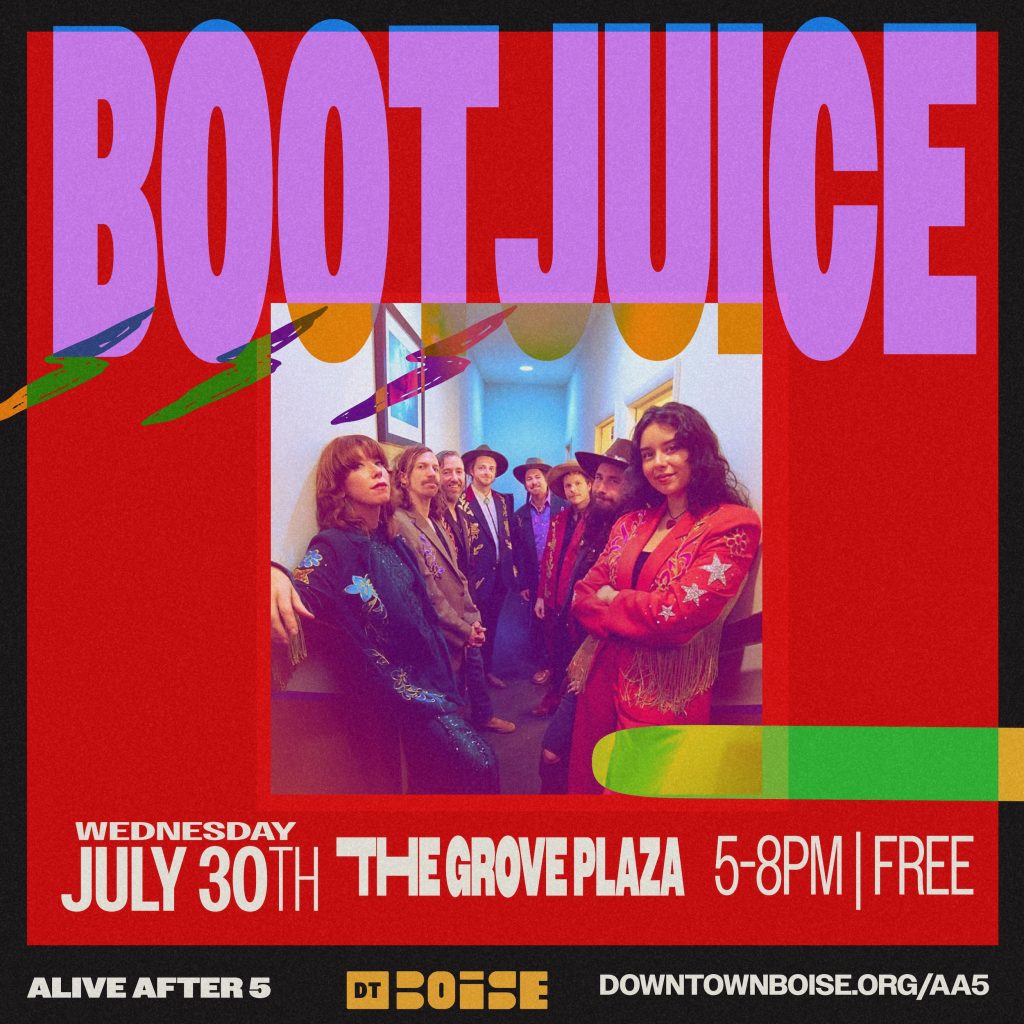 Boot Juice defies the typical assumption that a big band with horns is sticking to the well-worn path of funk and jazz. They certainly infuse those genres into the mix. More than anything though, this is an unabashed cosmic rock band intent on taking audiences into an alternate dimension of pure freedom and dance euphoria where the outside world ceases to exist. Their three-part vocal harmonies carry major impact with intoxicating doses of soul, blues and sultry appeal. The passionate musicianship and group synergy resonates in their pure sense of joy. Drawing favorable comparisons to the sound of The California Honey Drops and the spirit of the Talking Heads, you’ll have no doubt that the refreshing originality of Boot Juice always has a firm grip on the wheel.