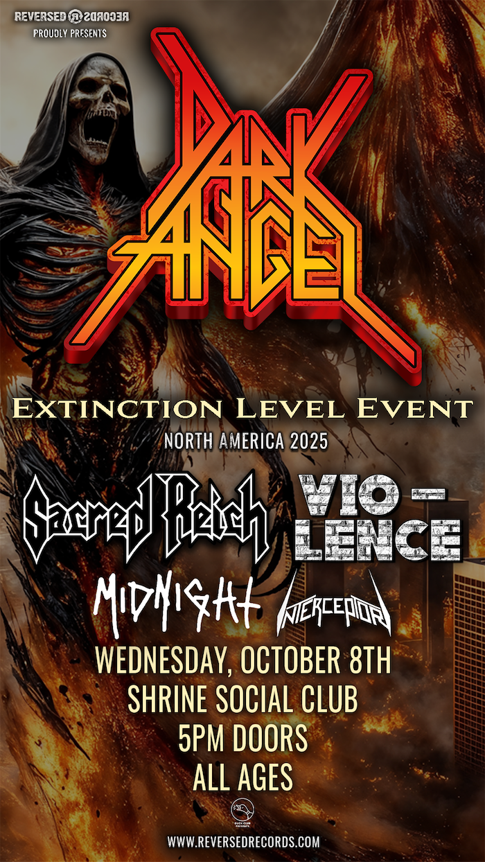 There was a time in the mid-‘80s when “thrash” was the fastest, heaviest, most extreme form of metal. That said, a handful of bands thrashed a liKle harder and with more feral abandon than their peers. Those chosen few inadvertently led the genre towards an even more brutal style of music that gained underground acceptance a few years later – death metal. Before that cri;cal point in ;me, however, ultra-thrash band Dark Angel stood on the precipice of devasta;on and innova;on. Too fast and noisy for some, jawdropping and groundbreaking for others, Dark Angel led a prickly, poisonous path beyond the evil riffs and whirlwind rhythms pioneered by Slayer. And Dark Angel drummer and songwriter Gene Hoglan was right there at the center of the storm (even coaching Slayer’s Dave Lombardo how to play double-bass beats for the breakthrough EP Haun%ng the Chapel). Forty years, and mul;ple seismic shakeups later, Dark Angel have returned with the spine-shaKering Ex%nc%on Level Event, their first album of original material since 1991’s colossal Time Does Not Heal. “Musically, lyrically, and vocally, I’m so stoked about this album,” says Hoglan, the veteran drummer-ofall-trades and ;meclock behind almost too many influen;al metal groups to count – Testament, Dethklok, Strapping Young Lad, Fear Factory, and Death graduate tribute band, Death To All. “I’m really excited about Dark Angel right now, and everyone who’s heard the new album is losing their minds. Every ;me I’d finish a song and send it over to the guys, everybody was, ‘Gene, this is my favorite song!’ ‘No, this is my favorite song!!’ ‘Dude, this is totally my favorite song!!!” That’s never a bad sign.” Ex%nc%on Level Event features new guitarist Laura Chris;ne, and a new level of produc;on, thanks to the advancements in technology since the late ‘80s and early ‘90s. Yet, the album follows the twisted barbed-wire path and innova;ve approach of fan favorites, Darkness Descends and Leave Scars, which remained landmark extreme thrash records decades aaer their release. That’s hardly a surprise since the majority of the lineup for the album is the same as on the aforemen;oned releases. The ;tle track of “Ex;nc;on Level Event” was wriKen by guitarist Jim Durkin, a decade ago, long before he suffered from severe liver disease, and, to the surprise of everyone, passed away in 2023. “Jim Durkin lea us with this badass tune,” Hoglan says. “It is so Dark Angel and I’m just so excited about it. We made it the lead-off song on the record, not as a tribute to Jim or because of sen;mental reasons – like, here is the song that Jim lea us – but because it’s just a totally killer song. He wrote it ten years ago, and by today’s standards it’s s;ll ball-crushing.” Fast and aggressive, “Ex;nc;on Level Event” is as fierce and infec;ous as Dark Angel’s best songs and features the band’s heralded bombas;c riffs and vocal structures. Hoglan and guitarist Laura Chris;ne wrote everything else on Ex%nc%on Level Event, each song rivalling the ferocity and musicality of the ;tle track; Chris;ne co-wrote five songs, and her wri;ng style rubbed off on Hoglan. “Atavis;c,” for example, is a full-on three-minute thrash metal barrage. “It’s primi;ve, it’s raw, and it takes you right back to the days of super-aggressive thrash metal,” Hoglan says. Other songs are a liKle slower, but no less incendiary. “Woke Up to Blood” is a tangled rollercoaster of jagged riffs and syncopated beats, the ;tle of which stemmed from a dog aKack. “[Guitarist] Eric Meyer came in with a big, nasty cut on his arm,” Hoglan says. “We asked him, ‘Eric, what happened?’ and he told us about how his wife’s dog aKacked him in the middle of the night. He said, ‘Dude, I was lying in bed asleep and then I was just bleeding profusely. I woke up to blood.’ And I went, ‘Hey, wait a minute. I goKa write that down in the ‘notes’ sec;on of my phone real quick.” Another track Gene describes as a “total onslaught” is “Terror Construct,” which he wrote about the way the media and corpora;ons team up to spread fear among the masses so they can con;nue to fill their pockets. “There’s no ques;on about it,” Hoglan says. “We are force-fed fear. It definitely comes at us from all sides – the lea and the right – and it’s everywhere, you can’t escape it because it comes from all angles. It’s terrible, but that’s how our society is gemng wired. People are forced to live in fear all the ;me because, for the networks and the big corpora;ons, fear means big money. If you put fear into the audience, they stay glued to the television and they watch all the commercials.” The seeds of Ex%nc%on Level Event were planted in late 2013 between the ;me when Testament stopped touring to work on their new record and Hoglan was scheduled to work on his next major project. “I finally had some ;me, so I said to Jim and vocalist Ron Rinehart, ‘Hey, I kinda have some ;me now. Would you guys be interested in trying Dark Angel again?,’ Hoglan recalls. “Because every ;me I’m over in Europe or some other country, the promoters of all these fes;vals and journalists are always asking, ‘You ever want to bring Dark Angel back? Let us know. We’d love to get some Dark Angel over here.’ Jim and I had spoken about it, and he said, ‘Hey, it sounds like fun. Let’s see what we can do.’ That’s when we put a toe in the water to find out if this would even work.” The band played a number of dates in Europe and South America. Then, in late 2014, Hoglan and founding guitarist Jim Durkin got together to write a bunch of riffs. Since Durkin had established a lucra;ve career outside the music industry and Hoglan was busy touring with Testament and working with Dethklok, Death To All, and other projects, it was difficult for the two long;me Dark Angel members to coordinate their schedules. “It
