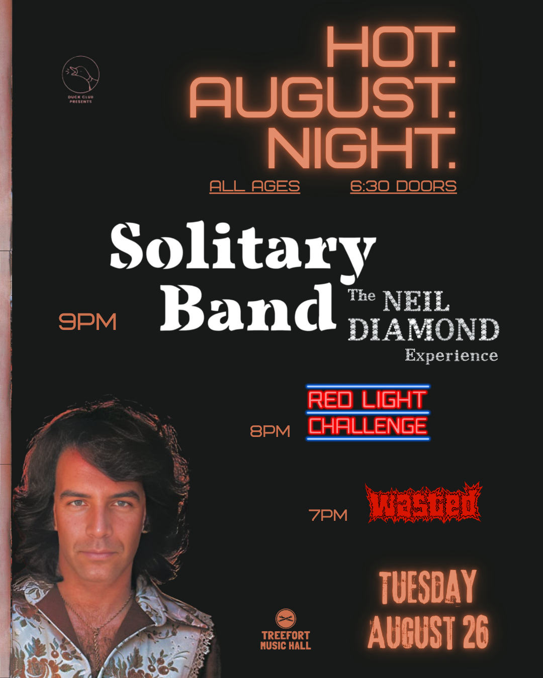 Boise, we are coming HOME FOR THE HOLIDAYS! Come see, hear, laugh, and dance during a rock-n-roll evening of amazing songs, featuring Neil’s all-time greatest hits: Cherry, Cherry, Holly Holy, Cracklin’ Rosie, Kentucky Woman, Sweet Caroline and more! Solitary Band:The Neil Diamond Experience has performed almost a decade of sellout “cabaret” style shows during the Xmas Holiday. It’s a holiday tradition! Table seating, gift baskets, everything you’ve loved about our Shrine show is now at TreeFort Music Hall!