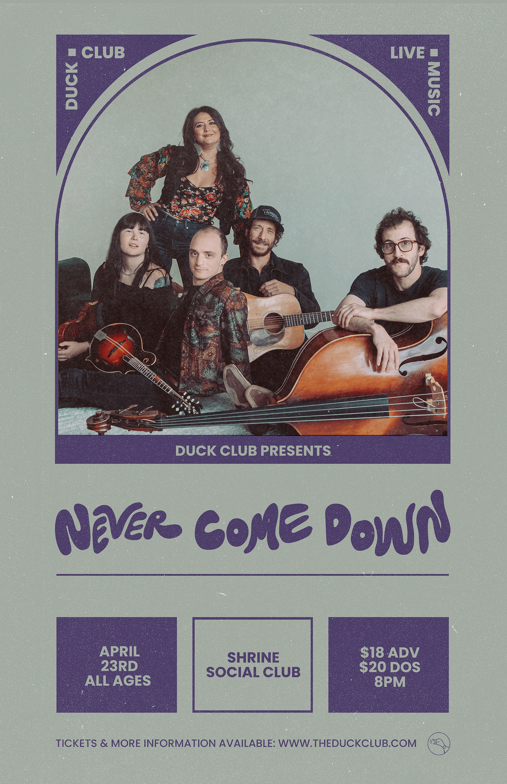 Formed in 2017, Never Come Down was born from the vibrant if not occasionally overlooked music scene of Portland, Oregon. Much like the city that inspired them, they’re a smart, charming, off-beat amalgam of varied backgrounds and tastes. In today’s paradoxical world where honoring tradition is often pitted against exploration and innovation, the band confidently walks the line between the modern and the tried-and-true. They’ve gained a loyal following and continue to win over audiences everywhere from Reykjavik’s Iceland Airwaves to San Francisco’s acclaimed Hardly Strictly Bluegrass. They’ve gained the attention of industry veterans, and toured in support of notable acts such as Yonder Mountain String Band and The Travelin’ McCourys, among others. Never Come Down’s live performance never disappoints- with showmanship, originality, songwriting and musical prowess far beyond their years.