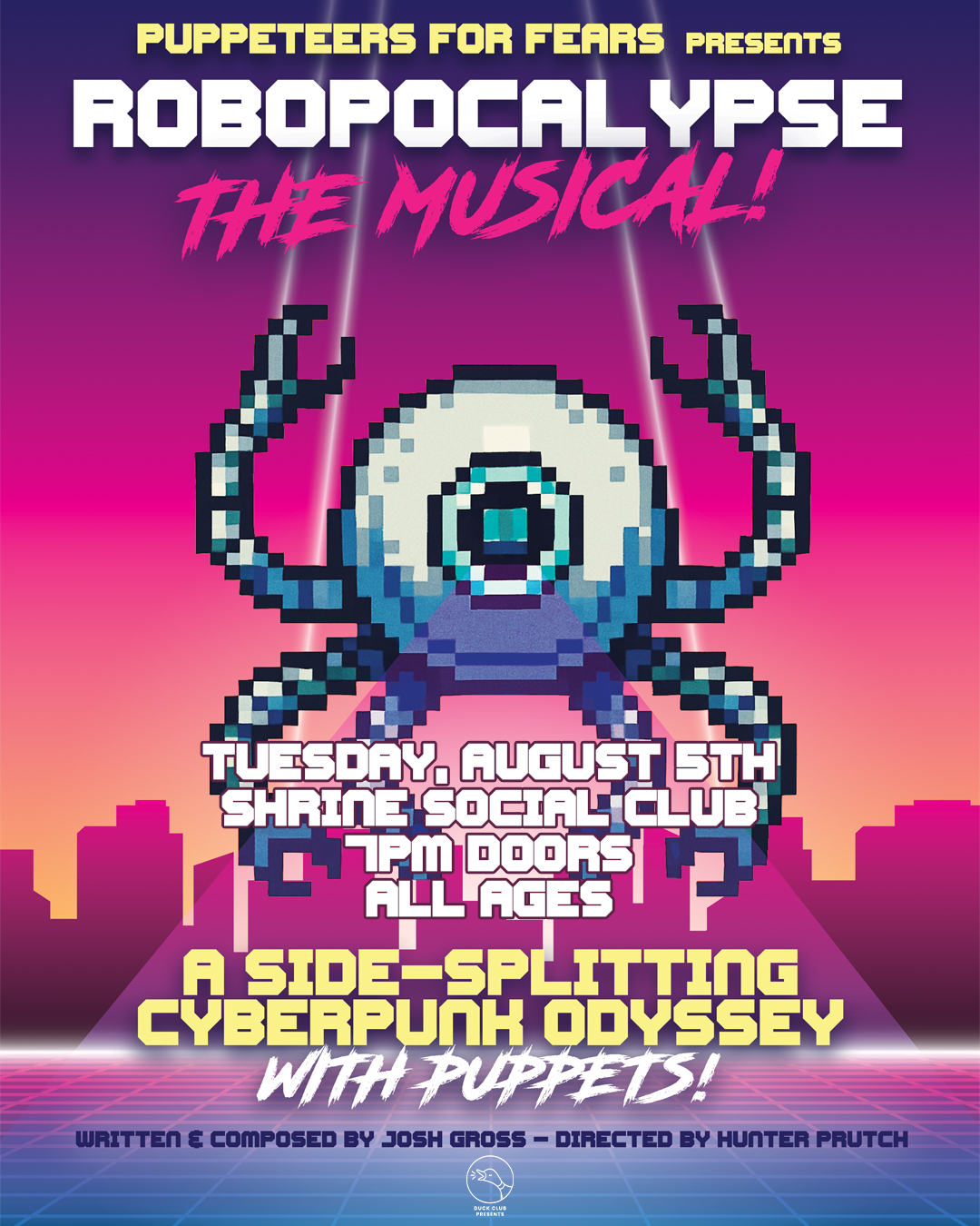 Puppeteers for Fears is an Oregon-based comedy troupe, specializing in original horror and science fiction rock’n’roll musicals performed with puppets. The company was founded as a one-night-only cabaret show for Halloween 2015, but was so popular that its various members kept going and never looked back. In the time since, PFF has written and performed a half dozen original rock and roll musicals covering everything from supernatural monsters to killer robots to lonely sasquatches, and sold out venues all over the country with its innovative and hilarious combination of puppetry, video, and live music.