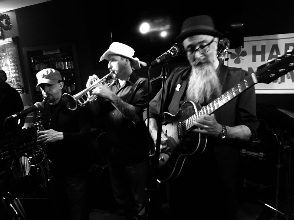 All of this is fairly easy to pull off considering that all the bands have the same members. Lester T. Raww sings while plucking guitar or ukulele, blowing trombone, occasionally providing an extended kazoo solo. Alex “Possum” Carvidi plays banjo, saxophone, musical saw, piano and accordion. “Gentleman” Jimmy Hadley sings and picks guitar, but he distinguishes himself as the ensemble’s trumpet player. In each of the groups, the rhythm section is held down by Col. Timothy Leather on bass and Slade Anderson.