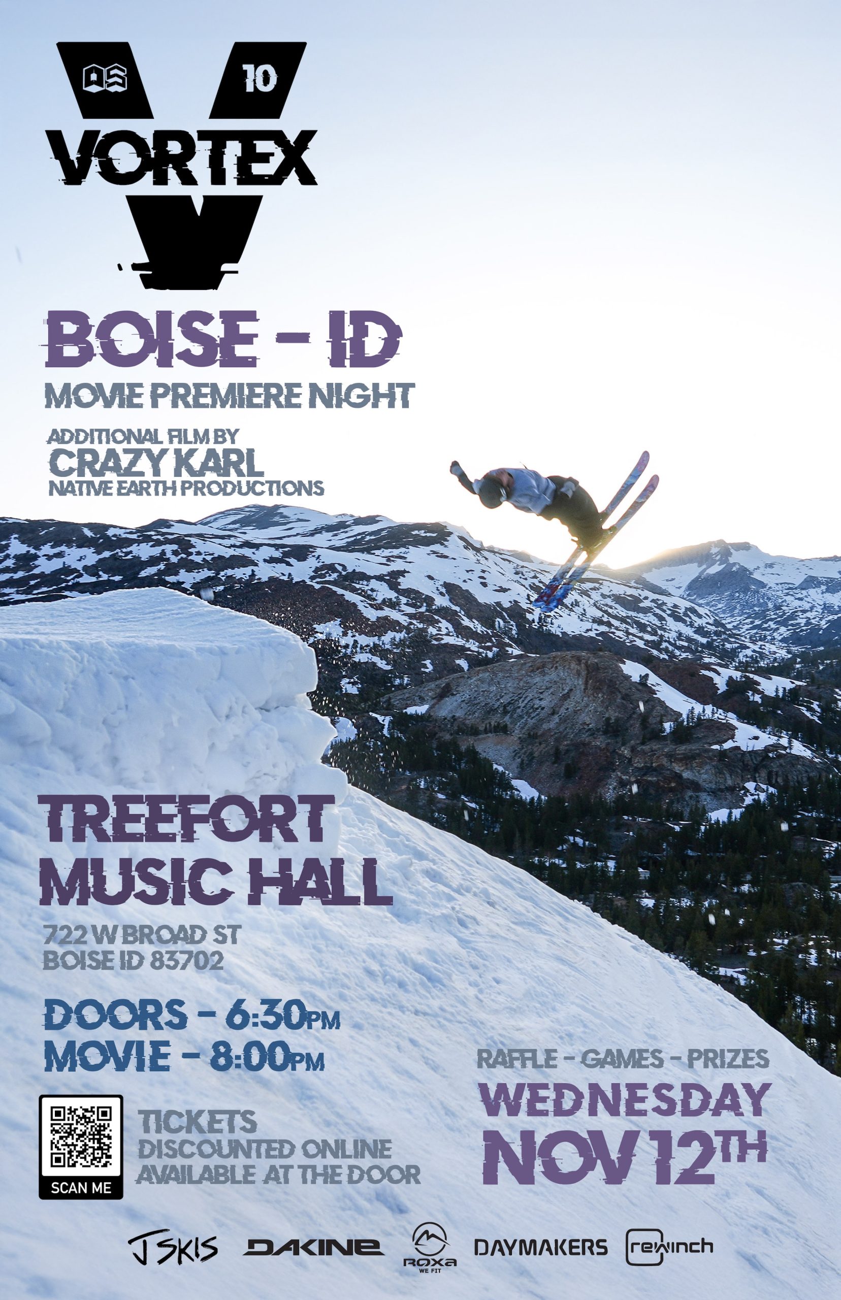 We are the OS Crew, a Boise based ski crew that has created our 10th annual street and backcountry freeski film – VORTEX. This is an action-packed movie that will have you on the edge of your seat the entire time. You can expect a lot of high-speed big air, technical rail tricks, gnarly slams and a creative take on skiing that you may have never seen before. We have premiered VORTEX all around North America this fall but we’ve saved the best stop of our tour for last… Our hometown of Boise, ID!!